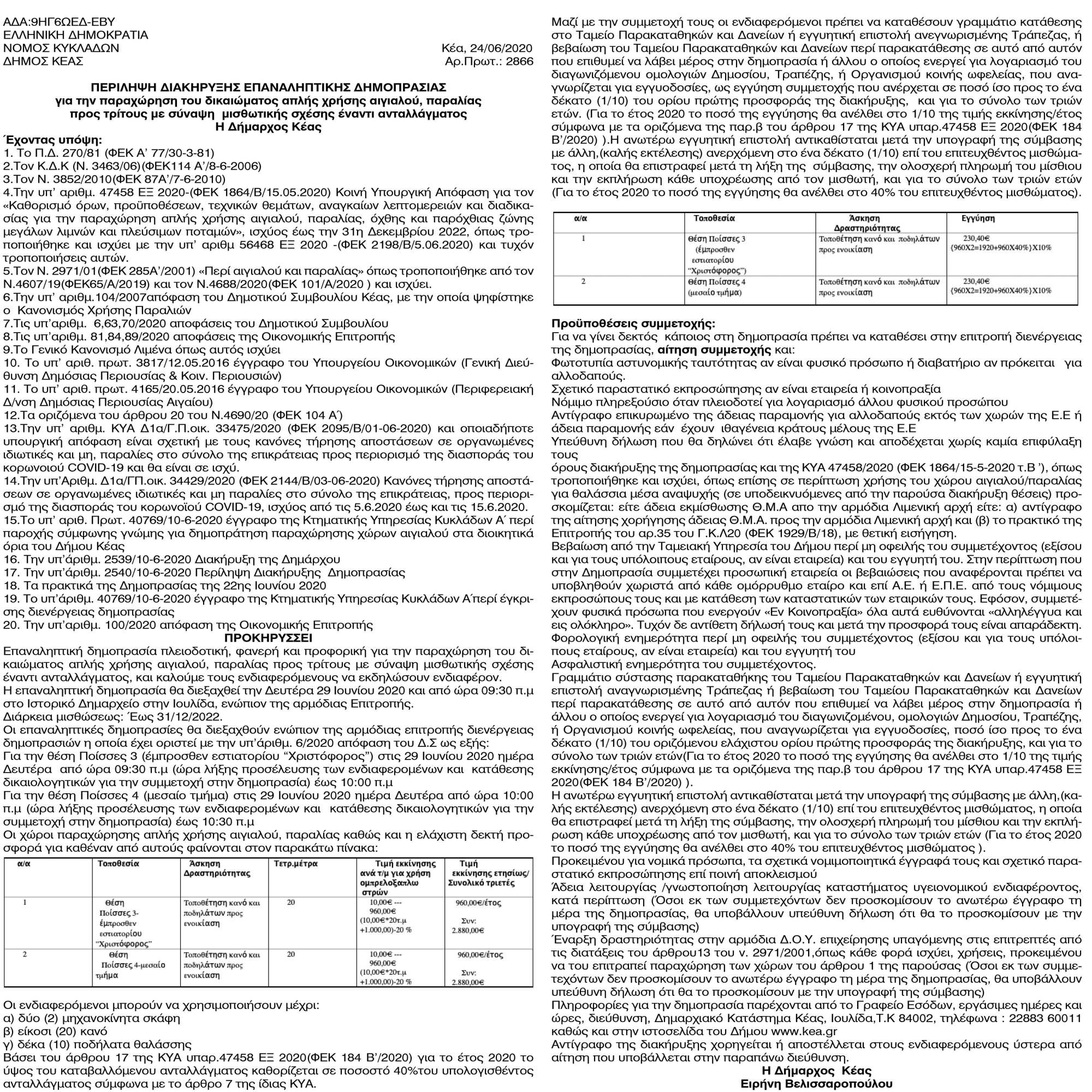 Περίληψη διακήρυξης επαναληπτικής δημοπρασίας για την παραχώρηση του δικαιώματος απλής χρήσης αιγιαλού του Δήμου Κέας Κείμενο Βλέπε εικόνα Αριθμός Φύλλου: 5400 Κατηγορία: Προκήρυξη Έργων - Δημοπρασίες