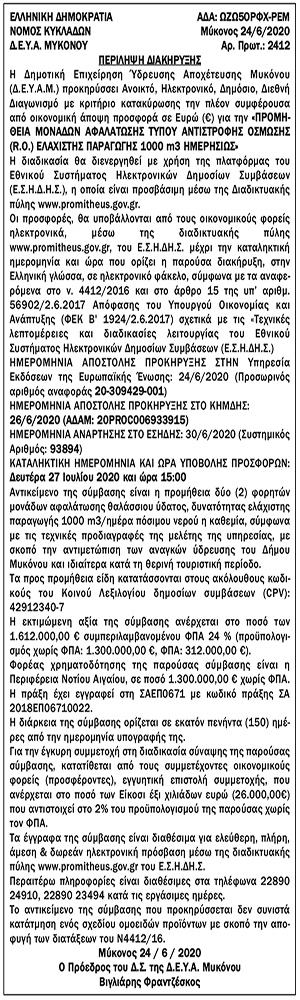 Περίληψη Διακήρυξης της Δ.Ε.Υ.Α. Μυκόνου Κείμενο Βλέπε εικόνα Αριθμός Φύλλου: Αριθμός Φύλλου 5403 Κατηγορία: Κατηγορία Περιλήψεις