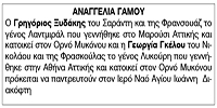 Αναγγελία Γάμου Ξυδάκη Γρηγορίου και Γκέλου Γεωργίας Κείμενο Βλέπε εικόνα Αριθμός Φύλλου: 5407 Κατηγορία: Αναγγελία Γάμου