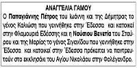 Αναγγελία Γάμου Παπαγιάννη Πέτρου και Νούσιου Βενετίας Κείμενο Βλέπε εικόνα Αριθμός Φύλλου: 5410 Κατηγορία: Αναγγελία Γάμου