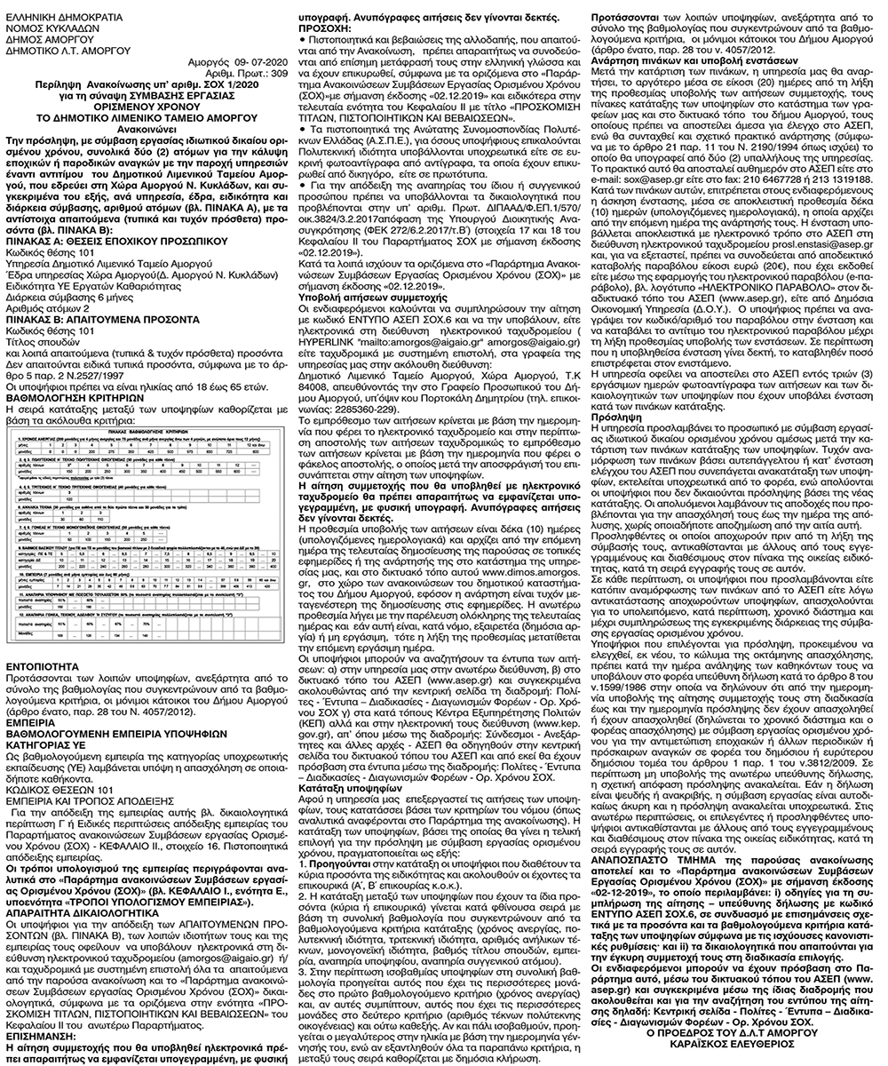 Περίληψη ανακοίνωση υπ' αριθμ. ΣΟΧ 1/2020 του Δ.Λ.Τ. Αμοργού Κείμενο Βλέπε εικόνα Αριθμός Φύλλου: 5411 Κατηγορία: Προκήρυξη Θέσεων