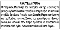 Αναγγελία Γάμου Γερμανού Μιλτιάδη και Σακαλή Μαρίας Κείμενο Βλέπε εικόνα Αριθμός Φύλλου: 5411 Κατηγορία: Αναγγελία Γάμου