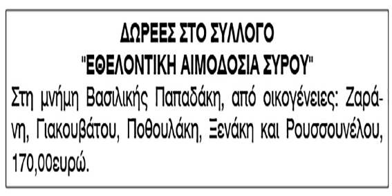 Δωρεές στο Σύλλογο Εθελοντικής Αιμοδοσίας Σύρου Κείμενο Βλέπε εικόνα Αριθμός Φύλλου: 5422 Κατηγορία: Δωρεές