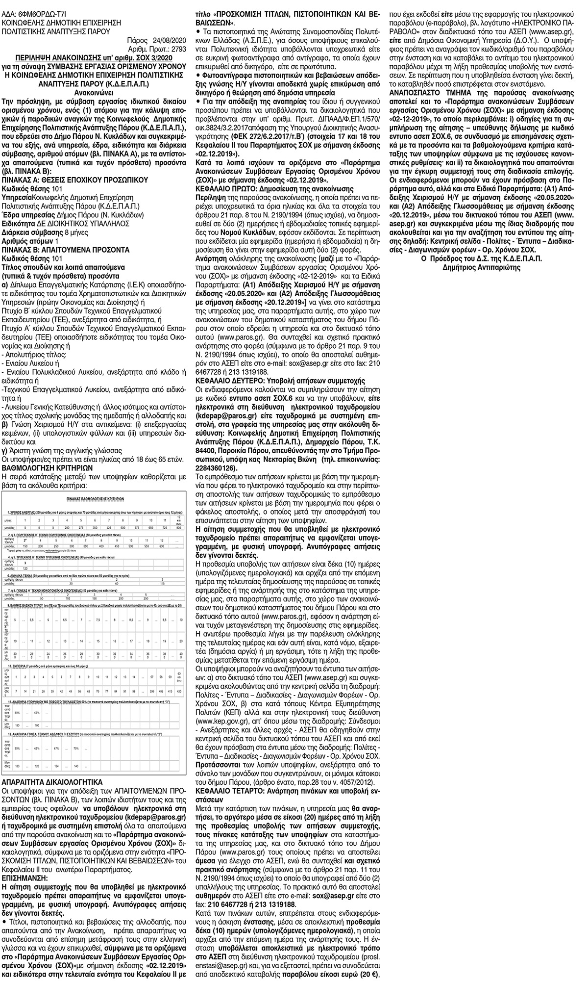 Περίληψη ανακοίνωσης υπ' αριθμ. ΣΟΧ 3/2020 της ΚΔΕΠΑ Πάρου Κείμενο Βλέπε εικόνα Αριθμός Φύλλου: 5456 Κατηγορία: Προκήρυξη Θέσεων