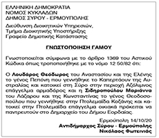Γνωστοποίηση Γάμου Λουδάρου Θεόδωρου και Σιδηροπούλου Μαριάνννας Κείμενο Βλέπε εικόνα Αριθμός Φύλλου: 5480 Κατηγορία: Γνωστοποίηση Γάμου
