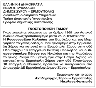 Γνωστοποίηση Γάμου Ρουσσουνέλου Καλλιόπης και Διαμαντόπουλου Πέτρου Κείμενο Βλέπε εικόνα Αριθμός Φύλλου: 5483 Κατηγορία: Γνωστοποίηση Γάμου