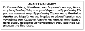 Αναγγελία Γάμου Κουκουδάκη Νικολάου και Αμαλίας Ματθαίου Κείμενο Βλέπε εικόνα Αριθμός Φύλλου: 5485 Κατηγορία: Αναγγελία Γάμου