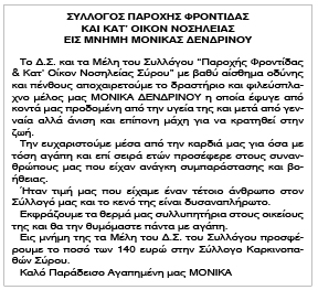 Εις μνήμη Μόνικας Δενδρινού Κείμενο Βλέπε εικόνα Αριθμός Φύλλου: Αριθμός Φύλλου 5491 Κατηγορία: Κατηγορία Ανακοίνωση