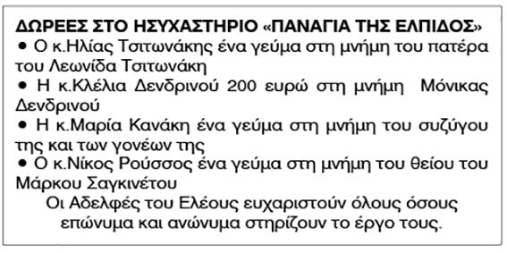 Δωρεές στο Ησυχαστήριο "Παναγία της Ελπίδος" Κείμενο Βλέπε εικόνα Αριθμός Φύλλου: 5499 Κατηγορία: Δωρεές