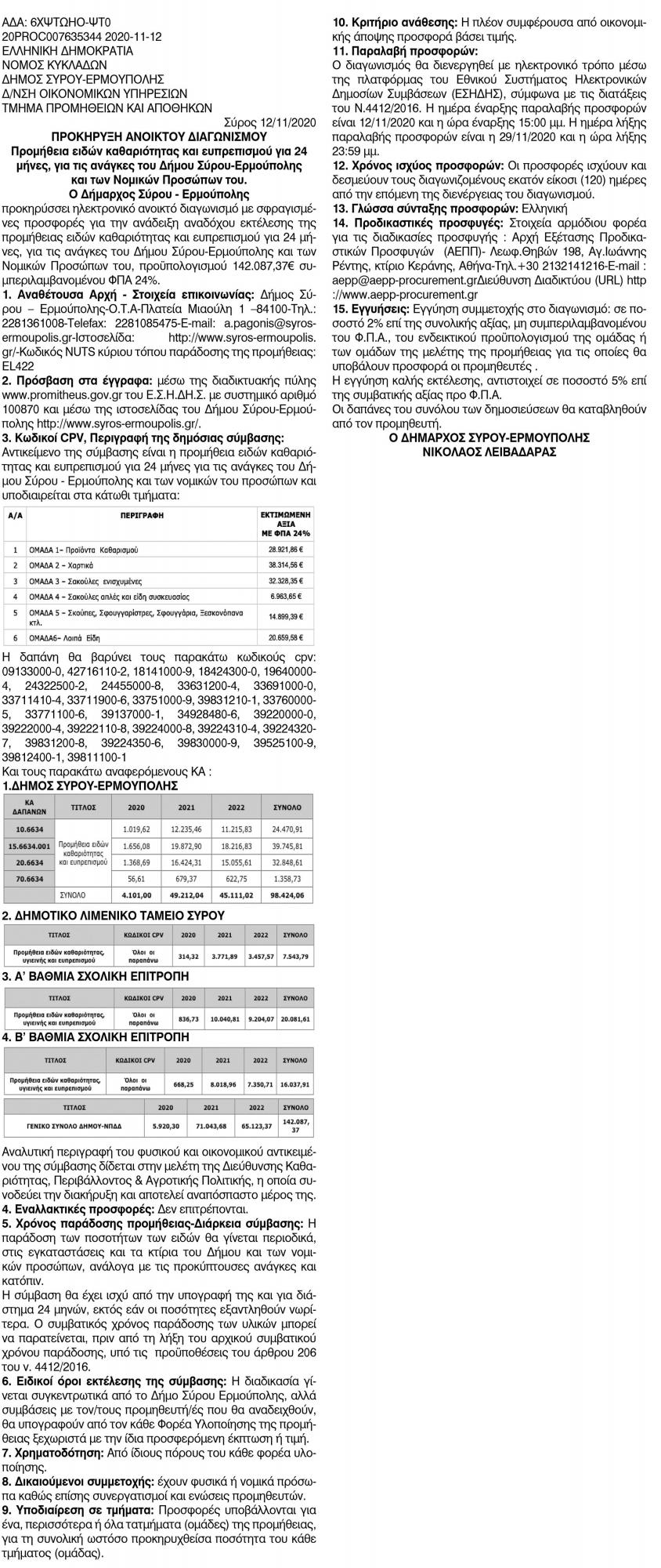 Προμήθεια ειδών καθαριότητας, ευπρεπισμού για 24 μήνες για τις ανάγκες του Δήμου Σύρου-Ερμούπολης και των Νομικών Προσώπων του Κείμενο Βλέπε εικόνα Αριθμός Φύλλου: Αριθμός Φύλλου 5500 Κατηγορία: Κατηγορία Προκήρυξη Έργων - Δημοπρασίες