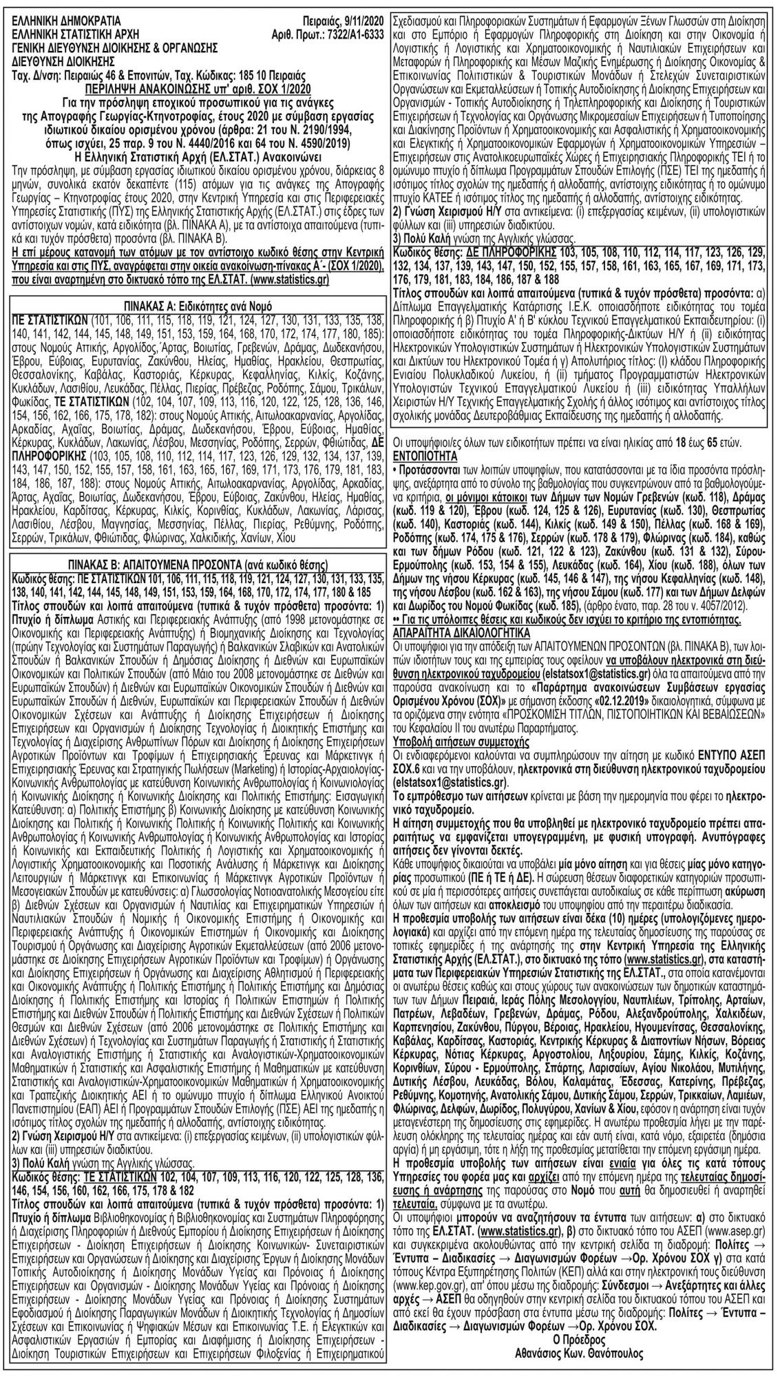 Περίληψη ανακοίνωσης υπ' αριθμ. ΣΟΧ 1/2020 της Ελληνικής Στατιστικής Αρχής Κείμενο Βλέπε εικόνα Αριθμός Φύλλου: Αριθμός Φύλλου 5510 Κατηγορία: Κατηγορία Προκήρυξη Θέσεων