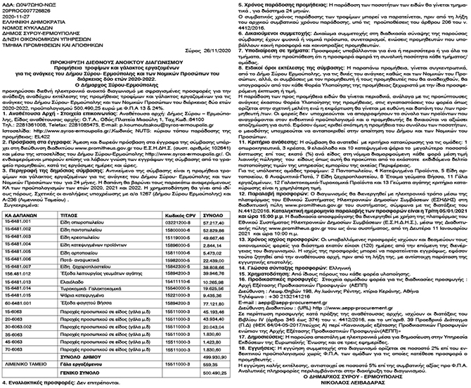 Προμήθεια τροφίμων και γάλακτος εργαζομένων για τις ανάγκες του Δήμου Σύρου-Ερμούπολης και των Νομικών Προσώπων του διάρκειας δύο ετών 2020-2022 Κείμενο Βλέπε εικόνα Αριθμός Φύλλου: Αριθμός Φύλλου 5511 Κατηγορία: Κατηγορία Προκήρυξη Έργων - Δημοπρασίες