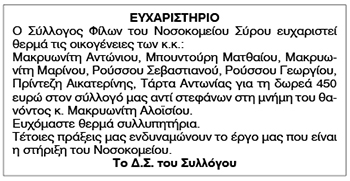 Ευχαριστήριο Συλλόγου Φίλων Νοσοκομείου Σύρου Κείμενο Βλέπε Εικόνα Αριθμός Φύλλου: Αριθμός Φύλλου 5513 Κατηγορία: Κατηγορία Ευχαριστήριο