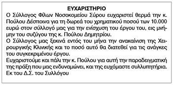 Ευχαριστήριο Συλλόγου Φίλων Νοσοκομείου Σύρου Κείμενο Βλέπε εικόνα Αριθμός Φύλλου: 5523 Κατηγορία: Ευχαριστήριο