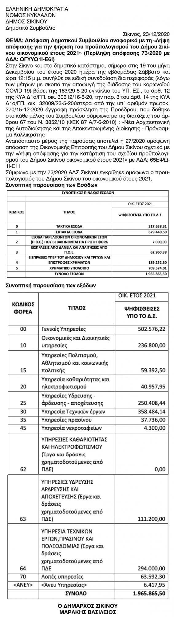 Λήψη απόφασης για την ψήφιση του προϋπολογισμού του Δήμου Σικίνου οικονομικού έτους 2021 Κείμενο Βλέπε εικόνα Αριθμός Φύλλου: Αριθμός Φύλλου 5530 Κατηγορία: Κατηγορία Προϋπολογισμοί