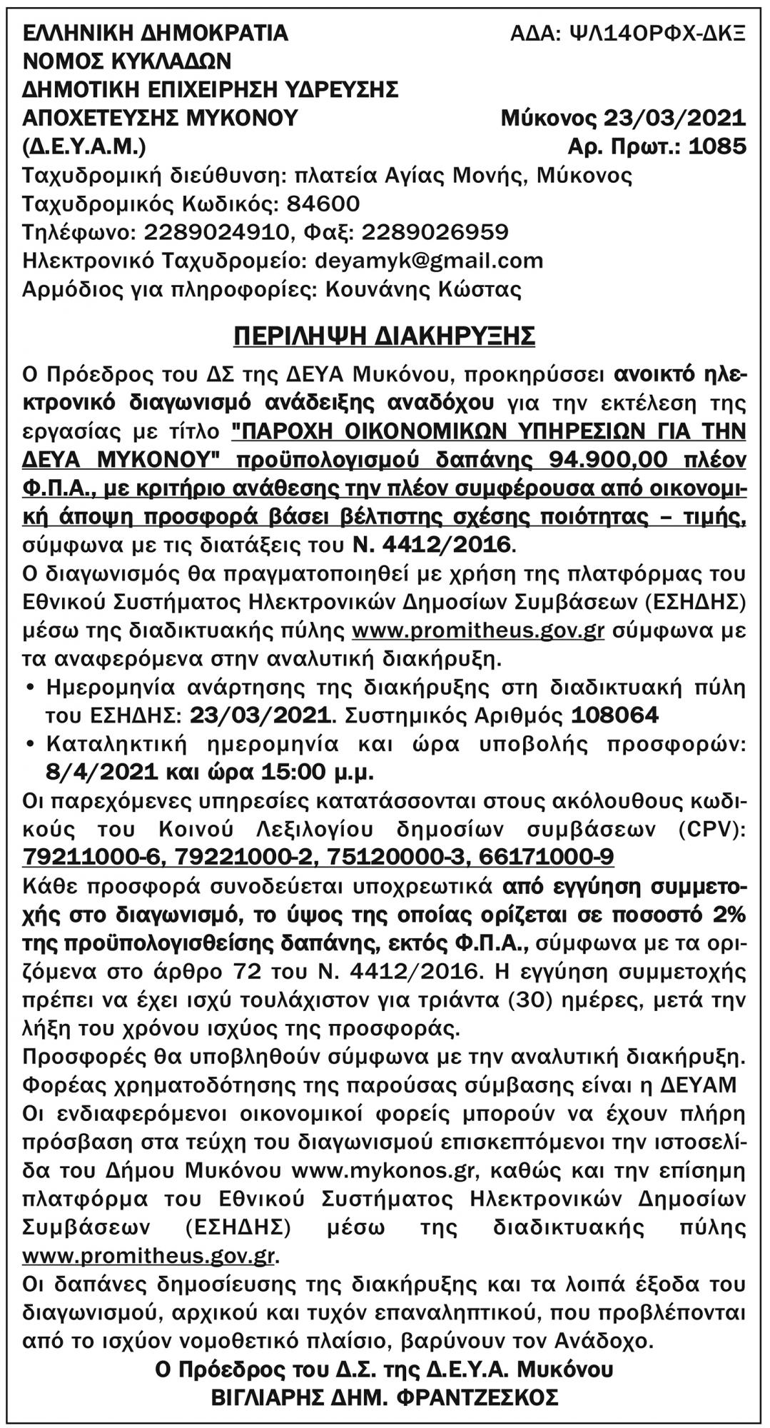 Παροχή Υπηρεσιών για την ΔΕΥΑ Μυκόνου Κείμενο Βλέπε εικόνα Αριθμός Φύλλου: Αριθμός Φύλλου 5590 Κατηγορία: Κατηγορία Προκήρυξη Έργων - Δημοπρασίες