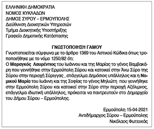 Γνωστοποίηση Γάμου Μαραγκού Λαυρέντιου και Νομικού Μαρίας Κείμενο Βλέπε εικόνα Αριθμός Φύλλου: Αριθμός Φύλλου 5607 Κατηγορία: Κατηγορία Γνωστοποίηση Γάμου