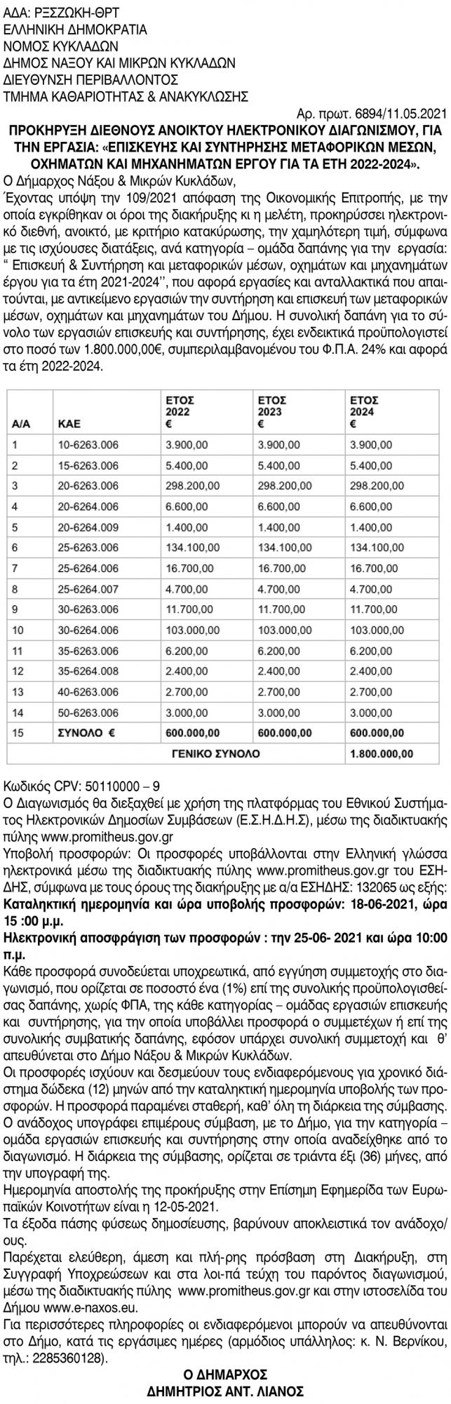 Επισκευή και συντήρηση Μεταφορικών Μέσων, Οχημάτων και Μηχανημάτων έργου για τα έτη 2022 - 2024 Δήμου Νάξου και Μικρών κυκλάδων Κείμενο Βλέπε εικόνα. Αριθμός Φύλλου: 5624 Κατηγορία: Προκήρυξη Έργων - Δημοπρασίες