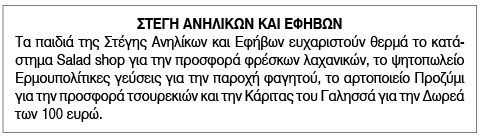 Δωρεές στη Στέγη ανηλίκων και εφήβων Σύρου Κείμενο Βλέπε εικόνα. Αριθμός Φύλλου: 5627 Κατηγορία: Δωρεές