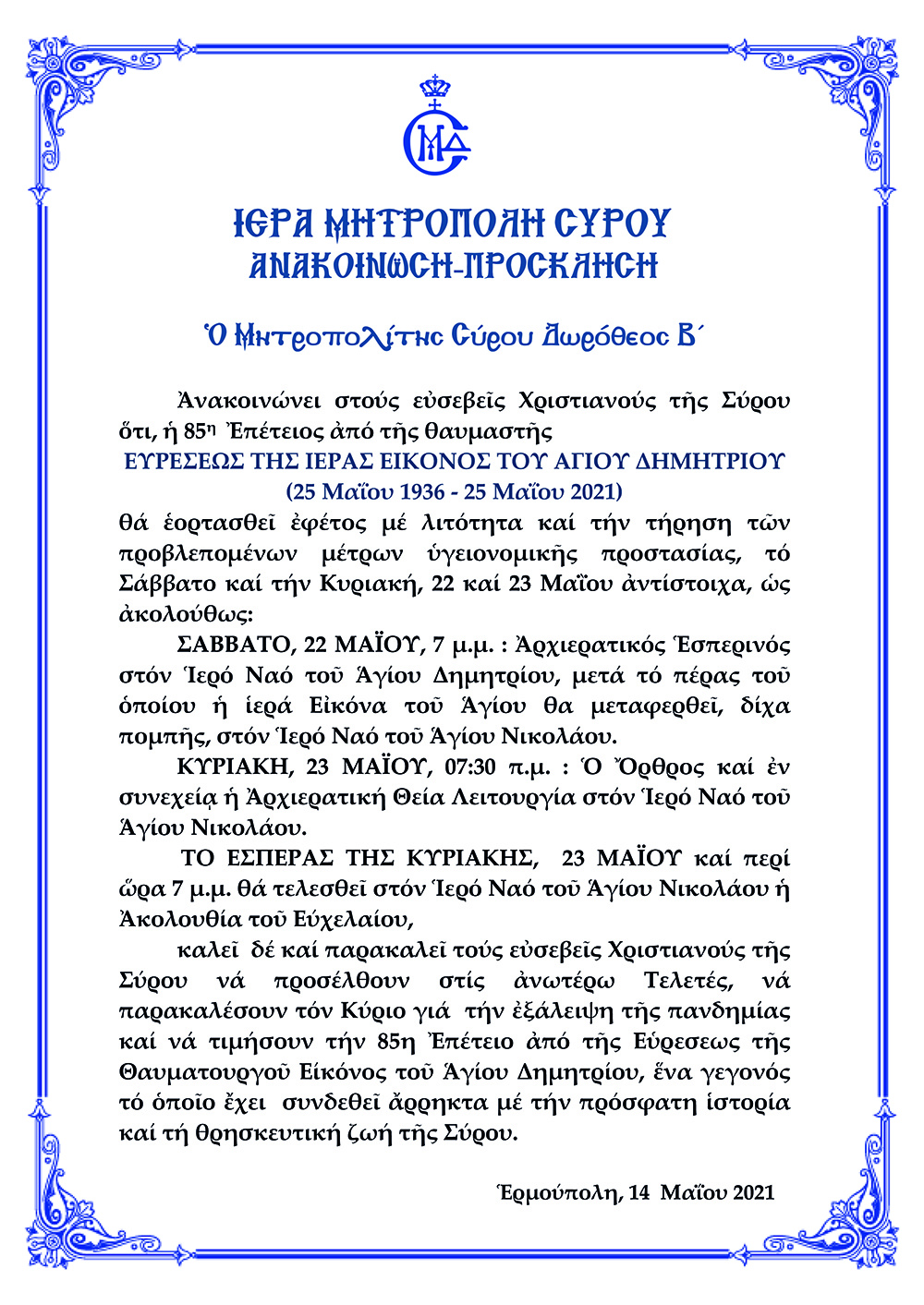 Ανακοίνωση Ιεράς Μητρόπολης Σύρου του Προγράμματος ευρέσεως Ιεράς Εικόνας Αγίου Δημητρίου Κείμενο Βλέπε εικόνα. Αριθμός Φύλλου: Αριθμός Φύλλου 5627 Κατηγορία: Κατηγορία Ανακοίνωση