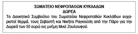 Δωρεές στο Σωματείο Νεφροπαθών Κυκλάδων