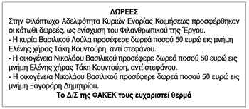 Δωρεές στην Φιλόπτωχο Αδελφότητα Κυριών Ενορίας Κοιμήσεως Κείμενο Βλέπε εικόνα. Αριθμός Φύλλου: Αριθμός Φύλλου 5649 Κατηγορία: Κατηγορία Δωρεές
