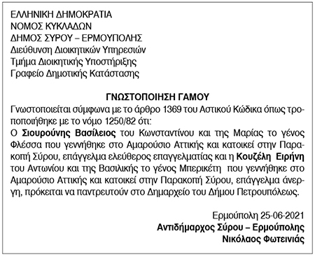 Γνωστοποίηση Γάμου Σιουρούνη Βασίλειου και Κουζέλη Ελένης Κείμενο Βλέπε εικόνα. Αριθμός Φύλλου: 5652 Κατηγορία: Γνωστοποίηση Γάμου