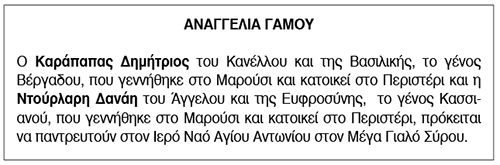 Αναγγελία Γάμου Καράπαπα Δημητρίου και Ντούρλαρη Δανάης Κείμενο Βλέπε εικόνα. Αριθμός Φύλλου: 5652 Κατηγορία: Αναγγελία Γάμου