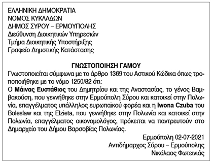 Γνωστοποίηση Γάμου Μάϊνα Ευστάθιου και Iwona Czuba Κείμενο Βλέπε εικόνα. Αριθμός Φύλλου: 5657 Κατηγορία: Γνωστοποίηση Γάμου
