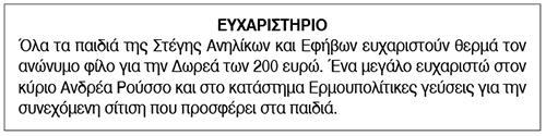 Ευχαριστήριο από την Στέγη Ανηλίκων και Εφήβων Σύρου Κείμενο Βλέπε εικόνα. Αριθμός Φύλλου: 5661 Κατηγορία: Ευχαριστήριο