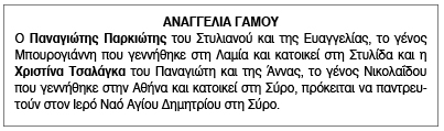 Αναγγελία Γάμου Παναγιώτη Παρκιώτη και Χριστίνας Τσαλάγκα Κείμενο Βλέπε εικόνα. Αριθμός Φύλλου: 5663 Κατηγορία: Αναγγελία Γάμου