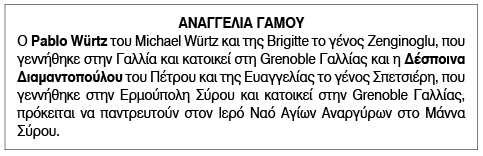 Αναγγελία Γάμου Δέσποινας Διαμαντοπούλου και Pablo Wurtz Κείμενο Βλέπε εικόνα. Αριθμός Φύλλου: 5669 Κατηγορία: Αναγγελία Γάμου