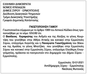 Γνωστοποίηση Γάμου Βασίλειου Κεραμιώτη και Παναγιώτας Γκουτζηγιάννη Κείμενο Βλέπε εικόνα. Αριθμός Φύλλου: 5669 Κατηγορία: Γνωστοποίηση Γάμου