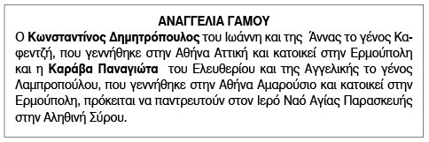 Αναγγελία Γάμου Κωνσταντίνου Δημητρόπουλου και Καράβα Παναγιώτας Κείμενο Βλέπε εικόνα. Αριθμός Φύλλου: 5669 Κατηγορία: Αναγγελία Γάμου