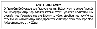 Αναγγελία Γάμου Γιακούπι Ευάγγελου και Κοσίαντου Ευαγγελία Κείμενο Βλέπε εικόνα. Αριθμός Φύλλου: 5672 Κατηγορία: Αναγγελία Γάμου
