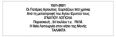 Θεία Λειτουργία Πατέρων Ιησουητών για τα 500 χρόνια από τη μεταστροφή του Αγίου Ιδρυτού τους ΙΓΝΑΤΙΟΥ ΛΟΓΙΟΛΑ Κείμενο Βλέπε εικόνα. Αριθμός Φύλλου: 5674 Κατηγορία: Ανακοίνωση