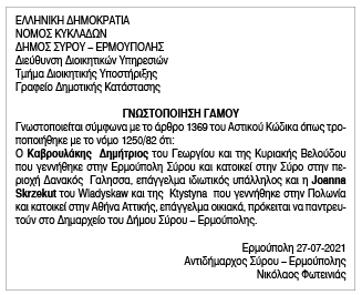 Γνωστοποίηση Γάμου Καβρουλάκη Δημητρίου και Joanna Skrekut Κείμενο Βλέπε εικόνα. Αριθμός Φύλλου: 5674 Κατηγορία: Γνωστοποίηση Γάμου
