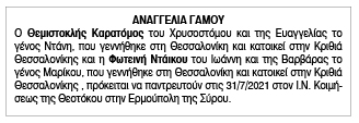 Αναγγελία Γάμου Θεμιστοκλή Καρατόμου και Φωτεινής Ντάικου Κείμενο Βλέπε εικόνα. Αριθμός Φύλλου: 5675 Κατηγορία: Αναγγελία Γάμου