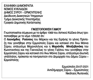 Γνωστοποίηση Γάμου Λεονάρδου Ρούσσου και Μαριάνθης Μπαξεβανάκη Κείμενο Βλέπε εικόνα. Αριθμός Φύλλου: 5675 Κατηγορία: Γνωστοποίηση Γάμου
