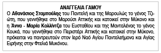 Αναγγελία Γάμου Αθανάσιου Σταμπούλη και Άννα- Μαρίας Κολλίντζα Κείμενο Βλέπε εικόνα. Αριθμός Φύλλου: 5676 Κατηγορία: Αναγγελία Γάμου