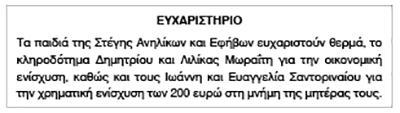 Ευχαριστήριο από την Στέγη Ανηλίκων και Εφήβων Σύρου Κείμενο Βλέπε εικόνα. Αριθμός Φύλλου: 5681 Κατηγορία: Ευχαριστήριο