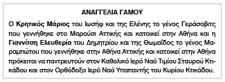 Αναγγελία Γάμου Κρητικού Μάριου και Γιαννίτση Ελευθερία Κείμενο Βλέπε εικόνα. Αριθμός Φύλλου: 5681 Κατηγορία: Αναγγελία Γάμου
