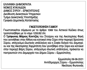 Γνωστοποίηση Γάμου Τρύφωνα Μάριου Κοντιζά και Σοφίας Χαλκιά Κείμενο Βλέπε εικόνα. Αριθμός Φύλλου: 5683 Κατηγορία: Γνωστοποίηση Γάμου
