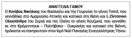 Αναγγελία Γάμου Κινόβα Νικόλαου και Ζίντσενκο Ολεκσάνδρα Κείμενο Βλέπε εικόνα. Αριθμός Φύλλου: 5684 Κατηγορία: Αναγγελία Γάμου