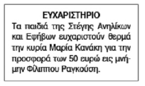 Ευχαριστήριο από την Στέγη Ανηλίκων και Εφήβων Σύρου Κείμενο Βλέπε εικόνα. Αριθμός Φύλλου: 5688 Κατηγορία: Ευχαριστήριο