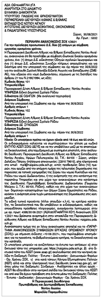 Περίληψη Ανακοίνωσης υπ' αριθ. ΣΟΧ 1/2021 της Περιφερειακής Διεύθυνσης Α/θμιας και Β/θμιας Εκπαίδευσης Ν. Αιγαίου Κείμενο Βλέπε εικόνα Αριθμός Φύλλου: 5699 Κατηγορία: Προκήρυξη Θέσεων