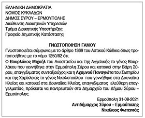 Γνωστοποίηση Γάμου Βουρλάκου Μιχαήλ και Αχαμνού Παναγιώτας Κείμενο Βλέπε εικόνα Αριθμός Φύλλου: Αριθμός Φύλλου 5699 Κατηγορία: Κατηγορία Γνωστοποίηση Γάμου