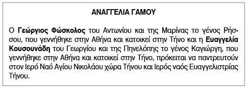 Αναγγελία Γάμου Γεώργιου Φώσκολου και Ευαγγελίας Κουσουνάδη Κείμενο Βλέπε εικόνα. Αριθμός Φύλλου: 5704 Κατηγορία: Αναγγελία Γάμου