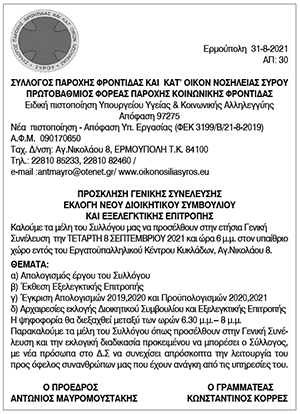 Πρόσκληση σε Γενική Συνέλευση από τον Σύλλογο Παροχής Φροντίδας και κατ' οίκον Νοσηλείας Κείμενο Βλέπε εικόνα. Αριθμός Φύλλου: Αριθμός Φύλλου 5704 Κατηγορία: Κατηγορία Πρόσκληση Γεν. Συνελεύσεων