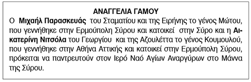 Αναγγελία Γάμου Μιχαήλ Παρασκευά και Αικατερίνης Νιτσόλα Κείμενο Βλέπε εικόνα. Αριθμός Φύλλου: 5713 Κατηγορία: Αναγγελία Γάμου